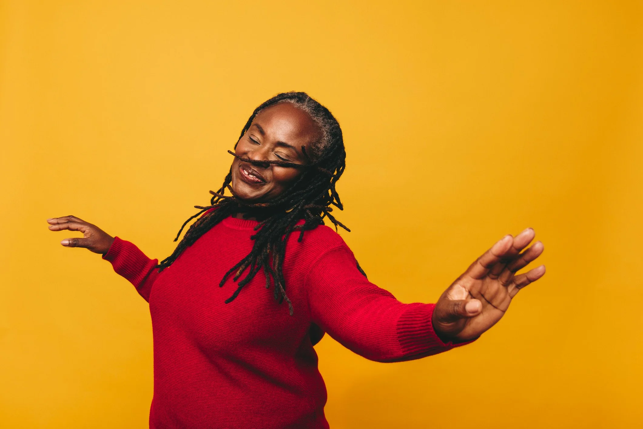 A woman with curly black hair wearing a white turtleneck shirt, mouth open as if singing or shouting, with a neutral gray background.